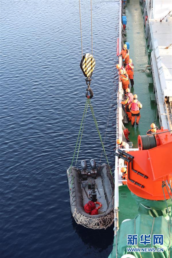 8月1日,北極科考隊隊員從“雪龍”號科考船上放出橡皮艇,準備乘坐橡皮艇回收錨碇式潛標。 新華社記者申鋮攝