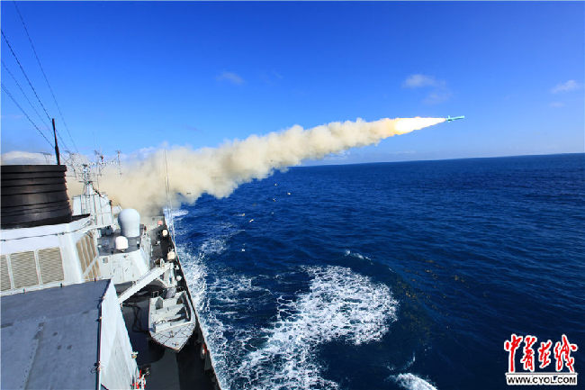 2008年11月8日,海口艦在某海域參加實彈演習,圖為??谂灠l(fā)射反艦導彈。