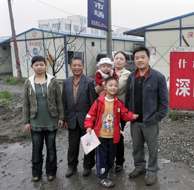 2009年5月8日,四川省什邡市,在地震中受災(zāi)的徐興蓉全家在自家板房小區(qū)門口。2008年8月8日,徐興蓉在什邡產(chǎn)下“奧運(yùn)寶寶”。張曉理/攝