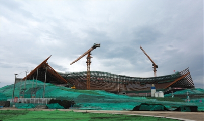 圖為正在建設(shè)中的中國館,其中主體結(jié)構(gòu)、鋼結(jié)構(gòu)已完成施工。 北京世園局供圖