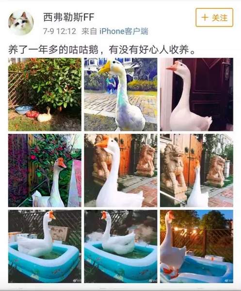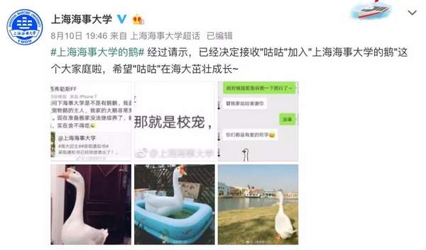 原來前些日子,一位名叫“西弗勒斯FF”的網(wǎng)友發(fā)微博稱,自己是上海松江區(qū)寵物鵝的主人,由于要搬家,養(yǎng)了一年半的鵝無法繼續(xù)養(yǎng)下去,想問上海海事大學能不能幫忙收養(yǎng),并稱自己的鵝非常英俊。