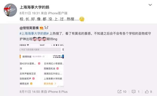 11日,“上海海事大學的鵝”還在微博上驕傲地說,校長好像都沒有上過熱搜,我們已經(jīng)上了,還配了一張“上海海事大學的鵝”登熱搜的截圖。