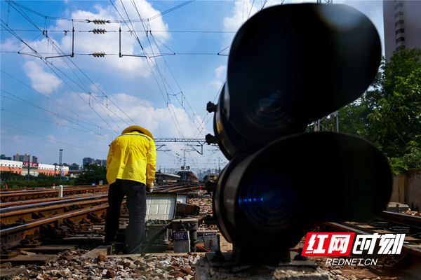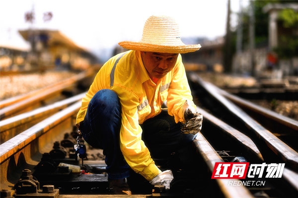 近日,記者跟隨長(zhǎng)沙電務(wù)段工作人員一同進(jìn)入長(zhǎng)沙火車站站場(chǎng),看到該段長(zhǎng)沙信號(hào)車間的10余名信號(hào)工,頭戴草帽、手拿工具正在進(jìn)行檢修作業(yè)?!拔覀児^(qū)主要是負(fù)責(zé)道岔‘病害’整治,工作強(qiáng)度大,上線作業(yè)5分鐘,工作服幾乎汗透?!?1歲的長(zhǎng)沙東信號(hào)檢修工區(qū)工長(zhǎng)董文海說道。