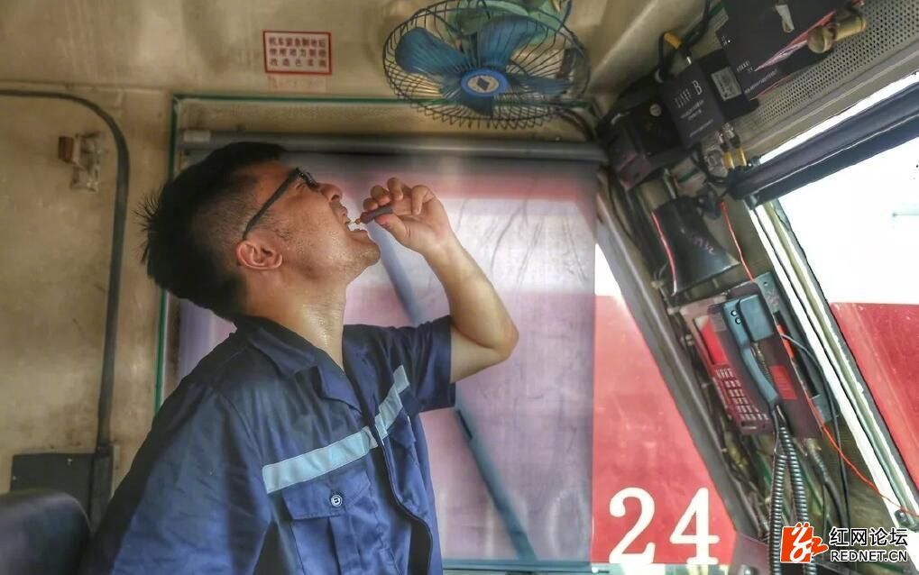 庫內(nèi)的機(jī)車車廂如同“蒸桑拿”,登車作業(yè)前,都會(huì)喝一支藿香正氣液,提前做好防暑工作。