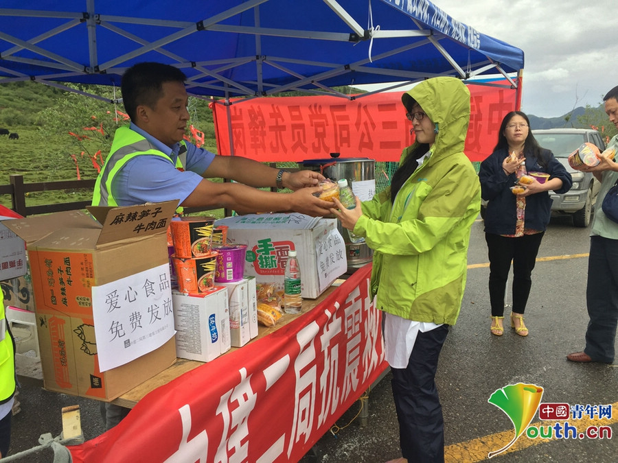 震后第二天,得知九寨溝還有大量游客沒有轉移,項目部3名黨員立即奔赴九寨溝,在那里設立了“愛心服務站”,為受災民眾、武警,交警和游客,準備了足夠數(shù)量的便攜式氧氣瓶、藥品、食品、礦泉水等物資,還特意早早燒好開水,放在保溫桶里。一天里,他們救助近200人次。