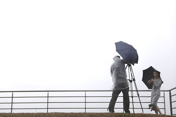 新華社記者邰劍秋、姜雪蘭在上海青草沙水庫頂著風雨做連線直播。