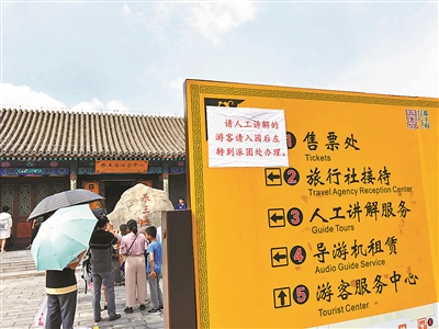 參團(tuán)的游客被帶入恭王府景區(qū)后,原有的導(dǎo)游便不再講解,由恭王府內(nèi)的導(dǎo)游進(jìn)行講解。在門口告示牌上,張貼有“請(需)人工講解的游客入園后左轉(zhuǎn)到派團(tuán)處辦理”的字樣。同時(shí),告示牌上寫著“景區(qū)內(nèi)嚴(yán)禁任何未經(jīng)批準(zhǔn)的經(jīng)營活動(dòng),如個(gè)人或團(tuán)體私自收費(fèi)講解”。