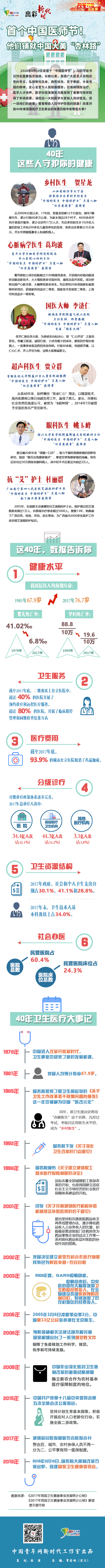 2018年8月19日是首個“中國醫(yī)師節(jié)”,習近平總書記作出重要指示強調,長期以來,我國廣大醫(yī)務人員響應黨的號召,弘揚敬佑生命、救死扶傷、甘于奉獻、大愛無疆的精神,全心全意為人民健康服務,在疾病預防治療、醫(yī)學人才培養(yǎng)、醫(yī)學科技發(fā)展等方面發(fā)揮了重要作用并取得了豐碩成果,涌現(xiàn)出一大批醫(yī)學大家和人民好醫(yī)生。讀一讀他們的故事,看看哪些人在守護你我的健康?改革開放40年來我國醫(yī)療衛(wèi)生事業(yè)的發(fā)展歷程中有哪些大事?