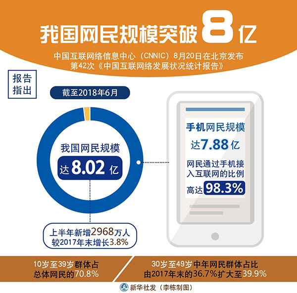 新華社北京8月20日電(記者王思北、施雨岑)中國(guó)互聯(lián)網(wǎng)絡(luò)信息中心(CNNIC)20日在京發(fā)布第42次《中國(guó)互聯(lián)網(wǎng)絡(luò)發(fā)展?fàn)顩r統(tǒng)計(jì)報(bào)告》。報(bào)告指出,截至2018年6月,我國(guó)網(wǎng)民規(guī)模達(dá)8.02億,上半年新增網(wǎng)民2968萬(wàn)人,較2017年末增長(zhǎng)3.8%,互聯(lián)網(wǎng)普及率達(dá)57.7%;手機(jī)網(wǎng)民規(guī)模達(dá)7.88億,網(wǎng)民通過(guò)手機(jī)接入互聯(lián)網(wǎng)的比例高達(dá)98.3%。