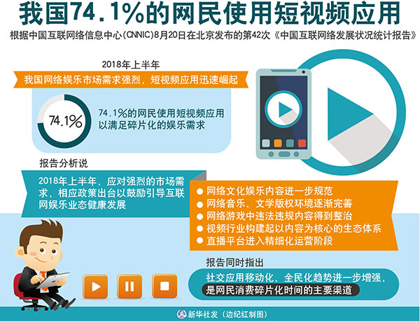 新華社北京8月20日電(記者施雨岑、王思北)根據(jù)中國互聯(lián)網(wǎng)絡(luò)信息中心(CNNIC)20日在京發(fā)布的第42次《中國互聯(lián)網(wǎng)絡(luò)發(fā)展狀況統(tǒng)計報告》,2018年上半年,我國網(wǎng)絡(luò)娛樂市場需求強烈,短視頻應(yīng)用迅速崛起,74.1%的網(wǎng)民使用短視頻應(yīng)用,以滿足碎片化的娛樂需求。