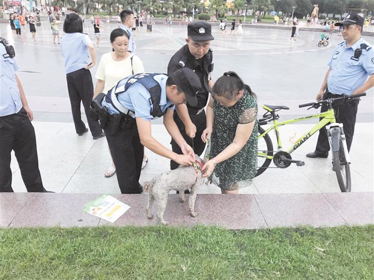 傍晚時(shí),蒲江縣世紀(jì)廣場很是熱鬧,是市民們飯后休閑娛樂散步的集中地,其中也不乏帶著愛犬出來散步的市民。蒲江縣公安局巡防大隊(duì)民警走上街頭,現(xiàn)場對沒有為愛犬套上牽引繩的市民進(jìn)行勸導(dǎo)并免費(fèi)發(fā)放牽引繩。面對民警的勸導(dǎo)和發(fā)放牽引繩的執(zhí)法方式,市民們紛紛點(diǎn)贊,“人性化的執(zhí)法方式在宣傳文明養(yǎng)犬重要性的同時(shí),也讓市民們更易接受,從實(shí)際出發(fā)緩和了矛盾,值得推廣!”