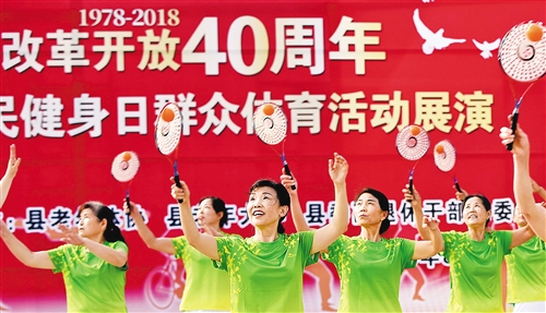 湖北省襄陽(yáng)市南漳縣舉行群眾體育活動(dòng)展演。上千名干部群眾分別展示了太極拳劍、健身氣功、柔力球、廣場(chǎng)舞等精彩節(jié)目,紀(jì)念改革開(kāi)放40周年。 熊明銀攝