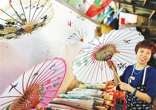 貴州省赤水市大同古鎮(zhèn),油紙傘傳人李珍霞在展示她制作的油紙傘。大同古鎮(zhèn)歷史悠久,擁有“獨(dú)竹漂”、竹編、油紙傘等非物質(zhì)文化遺產(chǎn)。 經(jīng)濟(jì)日?qǐng)?bào)-中國(guó)經(jīng)濟(jì)網(wǎng)記者 周明陽(yáng)攝