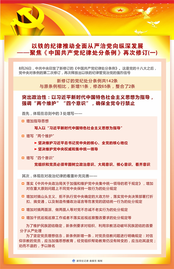 ?。玻度?,中共中央印發(fā)了新修訂的《中國共產(chǎn)黨紀(jì)律處分條例》。這是黨的十八大之后,黨中央對條例的第二次修訂,再次釋放出以鐵的紀(jì)律管黨治黨的強烈信號。
