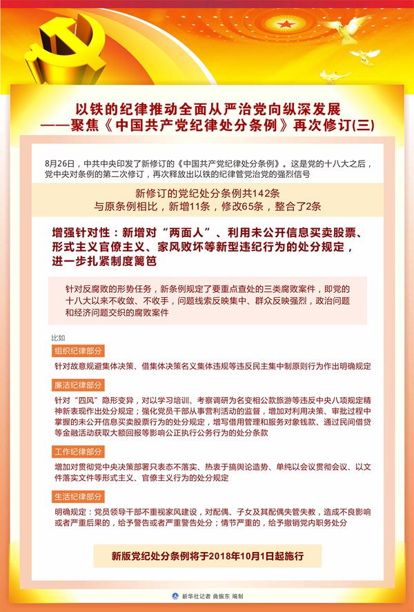 新版黨紀(jì)處分條例將于2018年10月1日起施行。它的頒布施行必將不斷提高紀(jì)律建設(shè)的政治性、時代性、針對性,以更加科學(xué)、更加嚴(yán)密、更加有效的思路舉措,推動全面從嚴(yán)治黨取得更大戰(zhàn)略性成果。