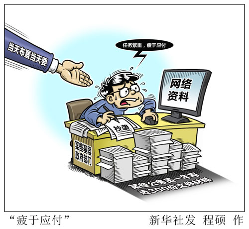 湖北省某縣委政研室干部說(shuō),一些黨員干部特別是領(lǐng)導(dǎo)干部能力不濟(jì),把發(fā)文、開(kāi)會(huì)當(dāng)作抓落實(shí)的主要方式方法,甚至將其做成履職盡責(zé)、推卸責(zé)任的“痕跡”,一些文件層層轉(zhuǎn)發(fā)、照抄照轉(zhuǎn),很多時(shí)候并無(wú)新的實(shí)質(zhì)性?xún)?nèi)容,完全是重復(fù)上級(jí)精神,造成基層干部有看不完的文件、開(kāi)不完的會(huì)。