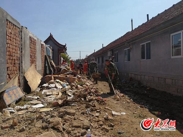 “前兩天泄洪時,洪水漫過路面進入了口子村,最深處積水有兩米多深?!鄙峡阪?zhèn)黨委副書記張文杰告訴記者,口子村是壽光當(dāng)?shù)厥転?zāi)最嚴重的村莊之一,為了防止即將到來的暴雨對口子村產(chǎn)生二次災(zāi)害,目前來自臨沂、泰安兩地的900名消防官兵正在和500多名當(dāng)?shù)馗刹咳罕?、志愿者一起抓緊時間對村里的垃圾和淤泥進行清理。抽排積水。