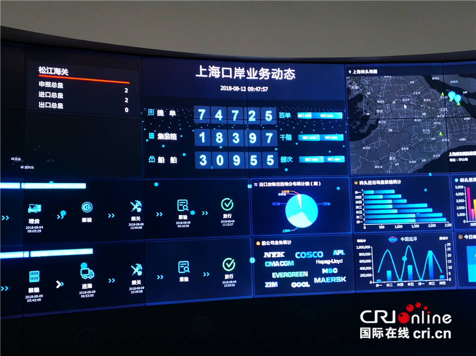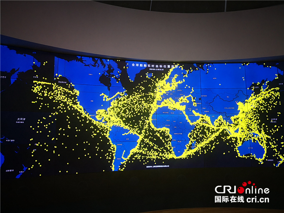 在上海國際貿(mào)易單一窗口運(yùn)營方、上海億通公司的電子大屏上,密密麻麻的黃色光點(diǎn)顯示著全球船舶的實(shí)時(shí)坐標(biāo)位置、上海口岸業(yè)務(wù)動態(tài)等關(guān)鍵信息。