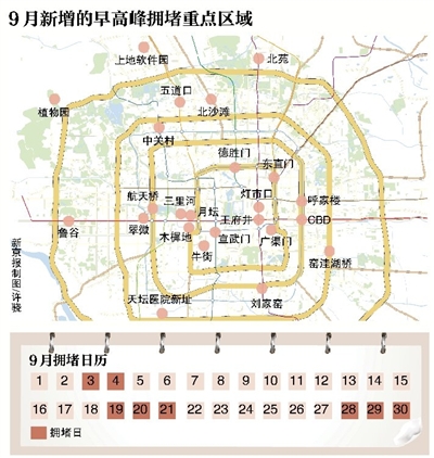 昨日上午,北京市交通委緩堵處、北京交通發(fā)展研究院相關負責人做客交通廣播“治堵大家談”節(jié)目時介紹,今年“最堵9月”預計會有8個重點擁堵日,主要集中在9月初和9月末,9月平均出行時間會比8月多花費50%。同時,還公布了本市包括五道口區(qū)域、CBD區(qū)域等7個一級堵點。