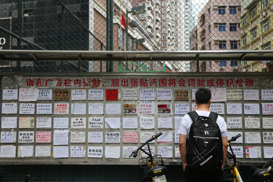 深圳市福田區(qū)崗廈村中的公告欄上貼滿了各種招租求租信息,一層層覆蓋著,圖為一位白領(lǐng)模樣的年輕人在看租房信息,崗廈村里像他這樣的白領(lǐng)還有很多,他們大都在附近的寫字樓里上班。這個(gè)位于深圳市中心的城中村房東靠房租可以月入10萬元,白領(lǐng)花千元只能租個(gè)床位。視覺中國(guó)供圖