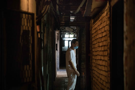 8月28日,天津市,來自山東的茂升在租住的居民樓道里乘涼。為了給妻子玉娟治療白血病,他們?cè)谂c中國(guó)醫(yī)學(xué)科學(xué)院血液病醫(yī)院一墻之隔的海光新村租下一間臥室,房間悶熱潮濕,每月房費(fèi)1100元,電費(fèi)自理。這兩棟小樓里住著大約30戶居民,不少是跟他們一樣來津求醫(yī)的患者和家屬。視覺中國(guó)供圖