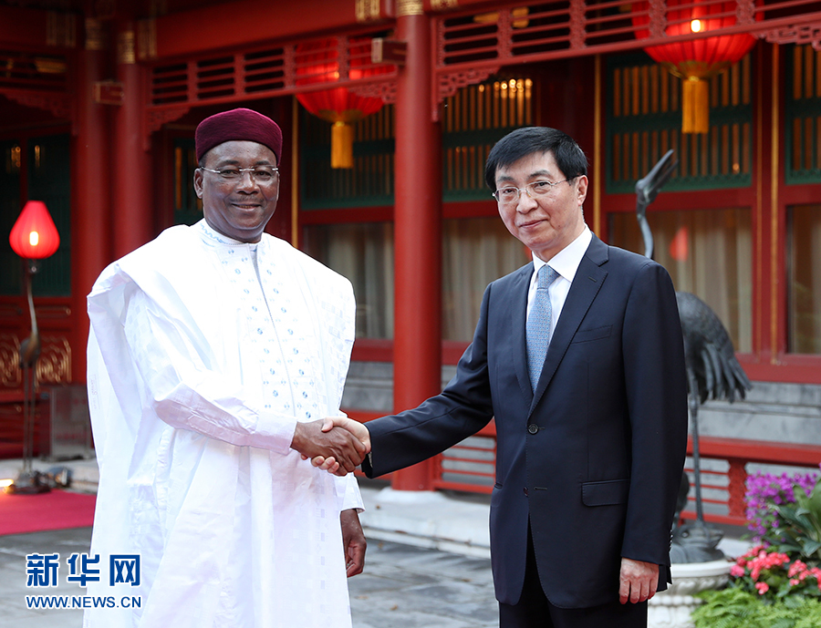 8月31日,中共中央政治局常委、中央書(shū)記處書(shū)記王滬寧在北京釣魚(yú)臺(tái)國(guó)賓館會(huì)見(jiàn)尼日爾總統(tǒng)伊素福。 新華社記者丁海濤攝