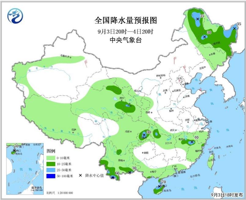 9月3日20時(shí)至4日20時(shí),內(nèi)蒙古東北部、黑龍江大部、甘肅中西部、青海北部和東部以及江南中北部、四川盆地東部和南部、云南西部和南部、廣西南部沿海、海南島和雷州半島等地的部分地區(qū)有中到大雨,局地暴雨;新疆東部、內(nèi)蒙古中東部、遼寧、山東半島有4~6級(jí)風(fēng);黃海中部和南部將有7~8級(jí)、陣風(fēng)9~10級(jí)的風(fēng)(見(jiàn)圖1)。