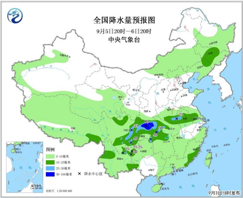 9月5日20時(shí)至6日20時(shí),吉林中部、遼寧北部、陜西南部、四川盆地大部、湖北中西部和東北部、湖南西北部、河南南部、安徽中部、江蘇西南部、福建東南部、廣東東部、云南北部和東南部的部分地區(qū)有中到大雨,其中,四川盆地東部、重慶北部局地有暴雨;新疆北部、內(nèi)蒙古東北部、華北南部、黃淮有4~6級(jí)風(fēng)(見(jiàn)圖3)。