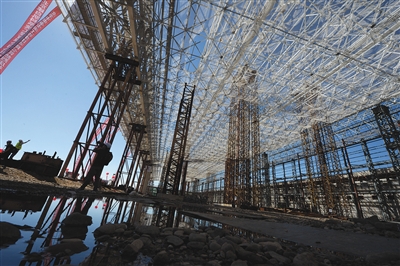 昨日,工作人員在為鋼結(jié)構(gòu)屋頂最后的一次提升做準備。上午10時37分,北京新機場南航基地1號機庫7200噸的鋼結(jié)構(gòu)屋架成功提升就位,標志著這座亞洲最大機庫封頂。新京報記者 吳江 攝