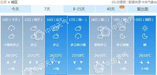 今天(14日)北京大部地區(qū)有小雨或零星小雨,早晨有輕霧或霧,公眾出行請注意交通安全。周六北風漸起,風力3-4級,晴爽的天氣將重現(xiàn),周日風力減小。周末氣溫略降,最高氣溫26-27℃,早晚體感略涼,早出晚歸注意添衣。