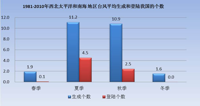 圖2 1981-2010年西北太平洋和南海地區(qū)臺(tái)風(fēng)平均生成和登陸我國(guó)的個(gè)數(shù) 李慧 制圖