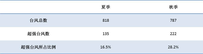 根據(jù)西北太平洋和南海生成臺(tái)風(fēng)的歷史資料,常年夏季生成的臺(tái)風(fēng)數(shù)量比秋季生成的臺(tái)風(fēng)要多,登陸我國(guó)的臺(tái)風(fēng)數(shù)量也比秋季多。七八月份生成臺(tái)風(fēng)的個(gè)數(shù)比九月以后生成的秋臺(tái)風(fēng)要多,但秋季更易出現(xiàn)超強(qiáng)臺(tái)風(fēng)。1949年至2017年,秋臺(tái)風(fēng)共生成787個(gè),其中超強(qiáng)臺(tái)風(fēng)有222個(gè),占比28.2%;這期間,夏季臺(tái)風(fēng)中超強(qiáng)臺(tái)風(fēng)的比例則為16.5%。