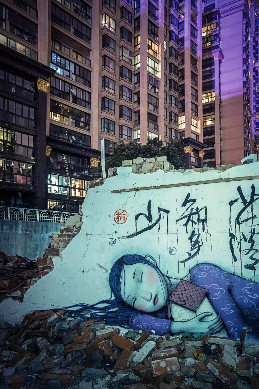 藝術(shù)家在墻上涂鴉出熟睡的少女、作畫的孩子等,