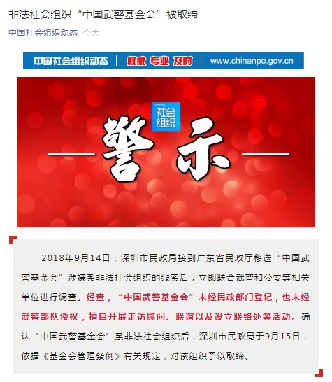 據(jù)民政部社會組織管理局微信公眾號“中國社會組織動態(tài)”消息,在確認“中國武警基金會”系非法社會組織后,深圳民政局于9月15日依據(jù)《基金會管理條例》有關(guān)規(guī)定,對該組織予以取締。