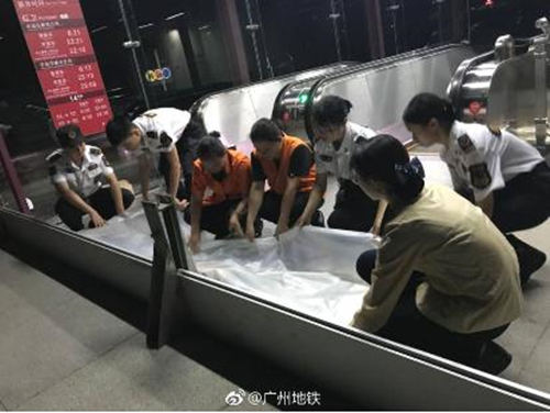 ▲臺風(fēng)來臨前,地鐵乘務(wù)員正在為地鐵站做好防汛工作。