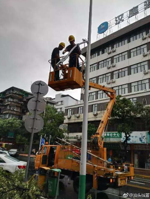 ▲臺風(fēng)來臨之際,汕頭市城照中心的工作人員,正在對被風(fēng)吹倒的路燈進行應(yīng)急處置。