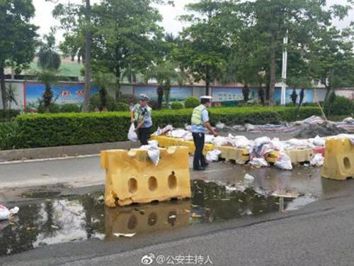 ▲面對超強臺風(fēng)“山竹”正面襲擊南粵,全省交警部門提高勤務(wù)響應(yīng)等級,加強值班備勤與警力部署,警力全員在崗在位。臺風(fēng)來臨之際,交警門正在搬運沙袋、清理路面。