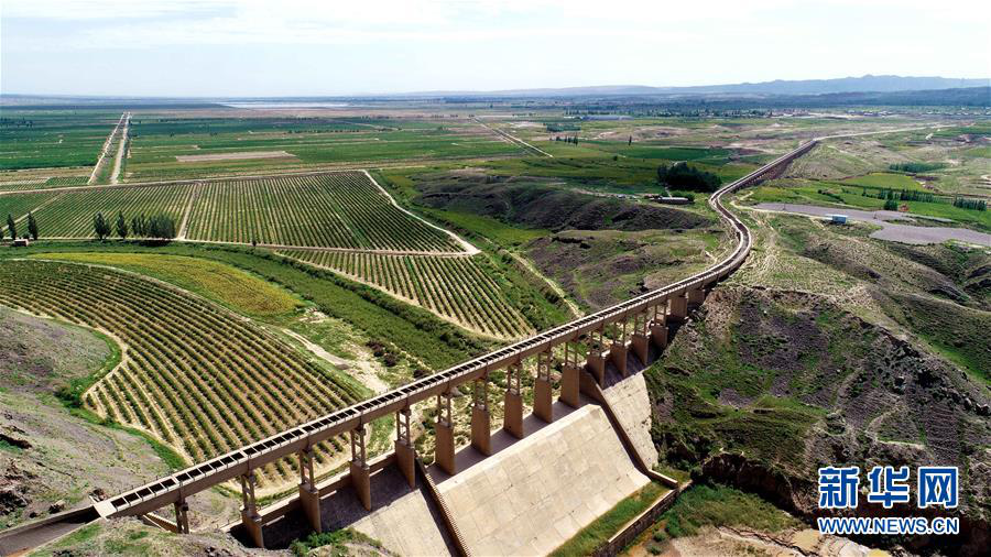 這是寧夏固海揚水工程長山頭渡槽(9月6日無人機拍攝)。? 新華社記者王鵬攝