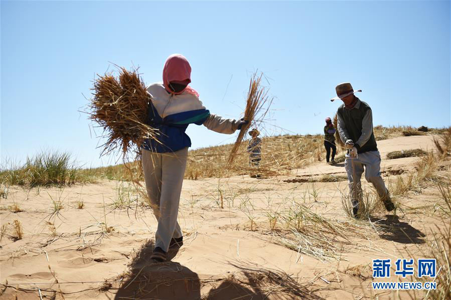 寧夏中衛(wèi)市沙坡頭區(qū)黑林村村民林治福(右)和周紅正在騰格里沙漠扎草方格(6月11日攝)。? 新華社記者盧鷹攝