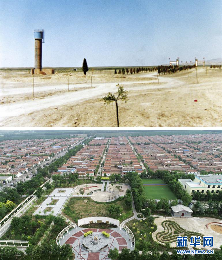 拼版照片:上圖為寧夏銀川市永寧縣閩寧鎮(zhèn)建設(shè)初期的資料照片;下圖為8月17日無人機拍攝的寧夏銀川市永寧縣閩寧鎮(zhèn)原隆村(新華社記者王鵬攝)。受益于福建、寧夏多層次、多形式、寬領(lǐng)域、全方位的扶貧協(xié)作,閩寧鎮(zhèn)這片曾經(jīng)的戈壁荒灘,被建設(shè)成現(xiàn)代化的生態(tài)移民示范鎮(zhèn)。6萬多名曾經(jīng)生活在西海固貧困山區(qū)的農(nóng)民陸續(xù)走出大山搬入閩寧鎮(zhèn),通過移民搬遷走上了脫貧致富之路。 新華社發(fā)