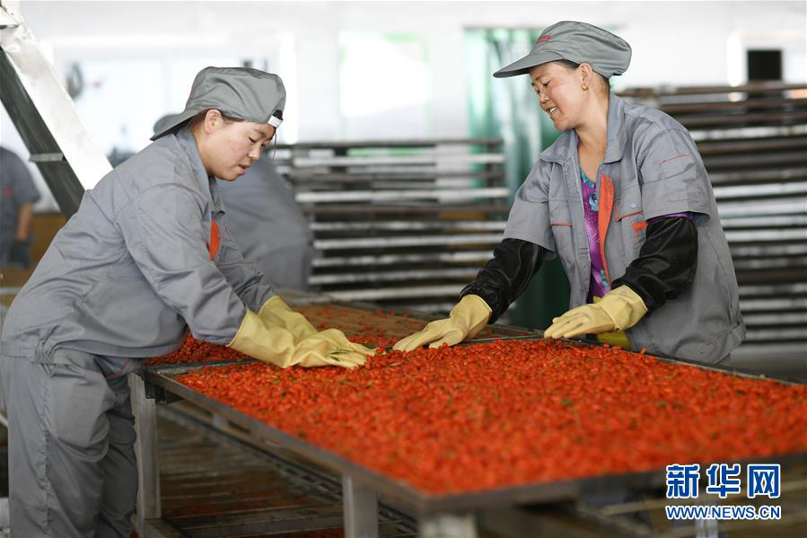 在寧夏同心縣潤德莊園枸杞基地,工人在清洗鮮枸杞(6月22日攝)。? 新華社記者王鵬攝