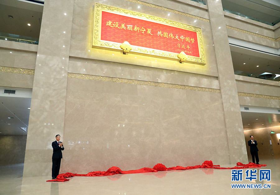 9月19日,中共中央政治局常委、全國(guó)政協(xié)主席、中央代表團(tuán)團(tuán)長(zhǎng)汪洋率中央代表團(tuán)出席向?qū)幭幕刈遄灾螀^(qū)贈(zèng)送紀(jì)念品儀式。這是汪洋和寧夏回族自治區(qū)黨委書記、人大常委會(huì)主任石泰峰一同為習(xí)近平總書記題詞賀匾揭幕。 新華社記者 劉衛(wèi)兵 攝