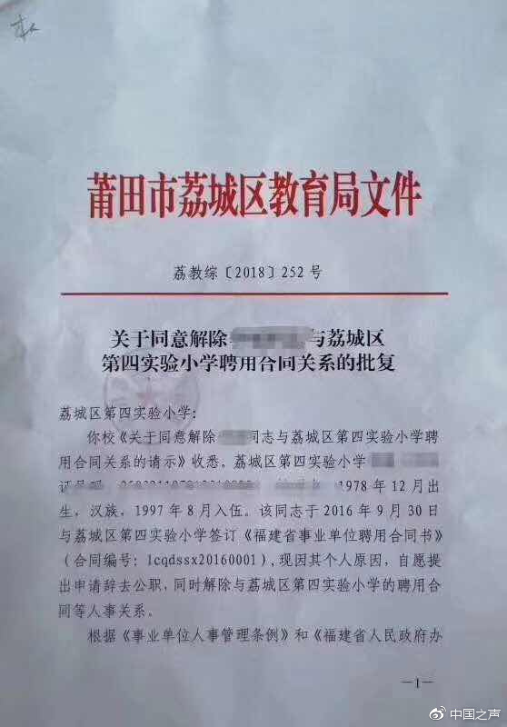 網(wǎng)上還流傳著一份落款為荔城區(qū)教育局9月19日的紅頭文件,該文件是發(fā)給荔城區(qū)第四實驗小學(xué)的,主要內(nèi)容是因老師個人原因,自愿提出申請辭去公職,教育局批復(fù)同意解除這名教師和學(xué)校的人事關(guān)系。有家長因此將此文件和微信截圖聯(lián)系在一起,在朋友圈表示,微信截圖中的“廖老師”已經(jīng)被解職。