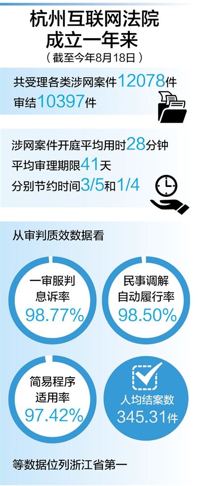 網(wǎng)上糾紛網(wǎng)上解,是設(shè)立互聯(lián)網(wǎng)法院的初衷之一。記者了解到,杭州互聯(lián)網(wǎng)法院發(fā)揮集中審理涉網(wǎng)案件的優(yōu)勢,截至今年8月20日,共受理涉網(wǎng)案件12122件,審結(jié)10441件;發(fā)布電子商務(wù)審判、知識產(chǎn)權(quán)保護等白皮書3份,連續(xù)4次發(fā)布十大典型案例,進一步強化了司法裁判的導(dǎo)向性作用。