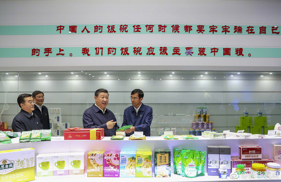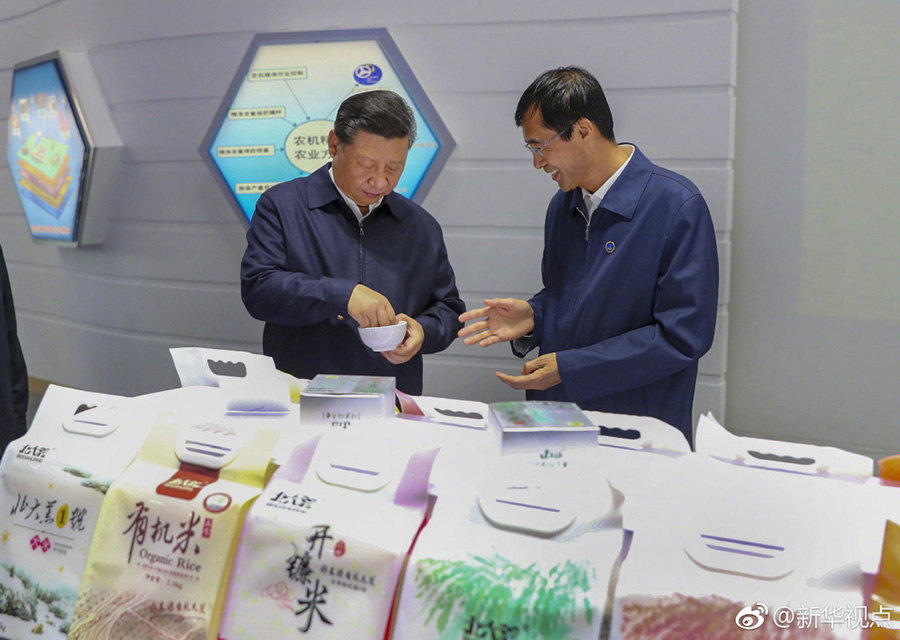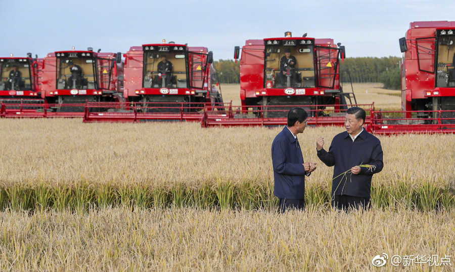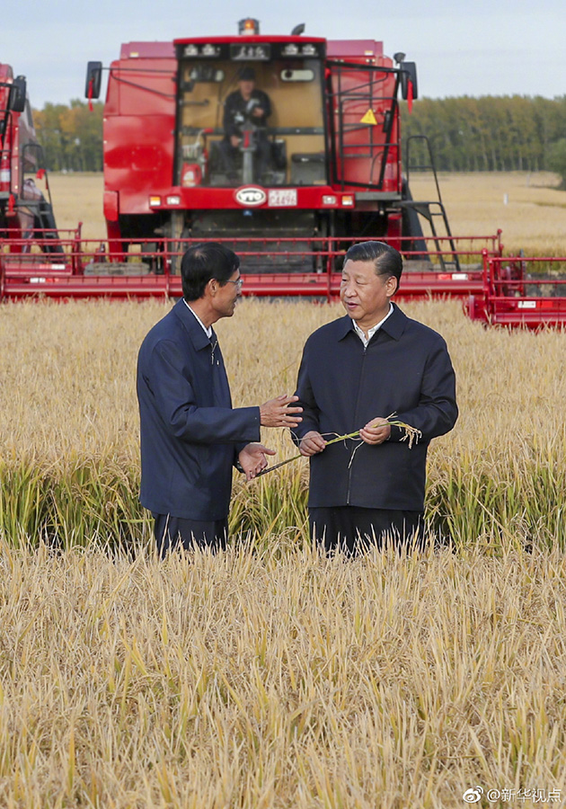 25日下午,首個(gè)“中國(guó)農(nóng)民豐收節(jié)”剛過(guò),習(xí)近平就深入三江平原腹地黑龍江農(nóng)墾建三江管理局,考察糧食生產(chǎn)和收獲情況。他邊聽(tīng)介紹,邊向農(nóng)場(chǎng)負(fù)責(zé)人詢(xún)問(wèn)今年收成如何、有沒(méi)有病蟲(chóng)害、能否做到連年豐收,并強(qiáng)調(diào)中國(guó)人的飯碗任何時(shí)候都要牢牢端在自己的手上。在北大荒精準(zhǔn)農(nóng)業(yè)農(nóng)機(jī)中心一樓大廳,當(dāng)?shù)爻霎a(chǎn)的米油豆奶等各類(lèi)農(nóng)產(chǎn)品擺滿(mǎn)展臺(tái)。習(xí)近平走近前去,雙手捧起一碗大米,意味深長(zhǎng)地說(shuō):“中國(guó)糧食,中國(guó)飯碗?!保ㄎ淖郑簭垥运?攝影:謝環(huán)馳)
