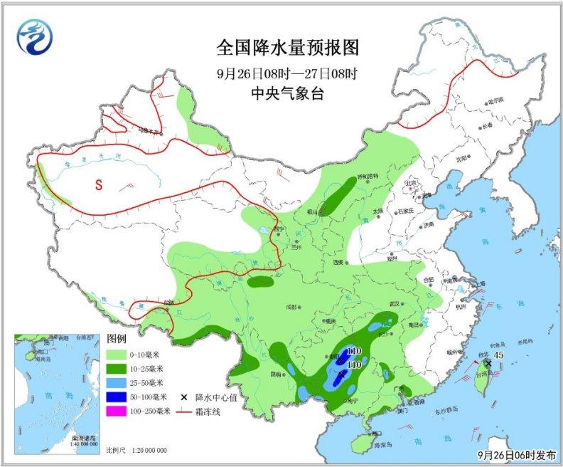 圖1 全國降水量預(yù)報(bào)圖(9月26日08時-27日08時)
