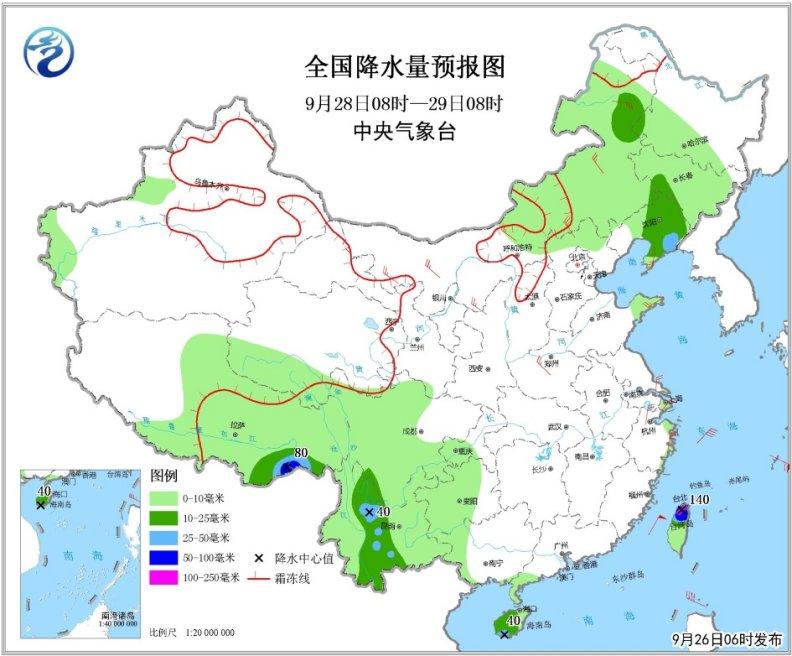 9月28日08時至29日08時,內(nèi)蒙古中東部、東北地區(qū)中南部、西南地區(qū)西南部和海南島大部以及西藏中東部等地的部分地區(qū)有中到大雨,局地有暴雨或大暴雨(50~140毫米)(見圖3)。東海大部海域、臺灣海峽、臺灣以東洋面、南海東北部海域、巴士海峽將有7~8級、陣風(fēng)9~10級大風(fēng),其中東海東南部海域、臺灣以東洋面的部分海域風(fēng)力可達(dá)9~11級、陣風(fēng)12~13級。