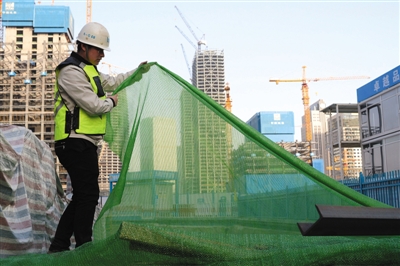 今年2月,中國(guó)鐵物大廈項(xiàng)目工地配備網(wǎng)眼更細(xì)密的防塵網(wǎng),有助更好控制揚(yáng)塵污染。 資料圖片/新京報(bào)記者 吳江 攝