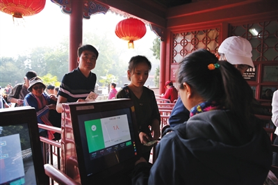 記者從香山公園了解到,國慶期間香山公園實施游客網(wǎng)上預(yù)約游覽制度,每日最大售票量7萬張。記者走訪注意到,香山公園門區(qū)已全部更換售驗票系統(tǒng),東門、北門設(shè)置了12臺綜合驗票機,可同時檢驗電子二維碼、紙票二維碼等,游客掃碼、屏幕上出現(xiàn)確認界面后即可入園,耗時僅需1-2秒。(記者周依)