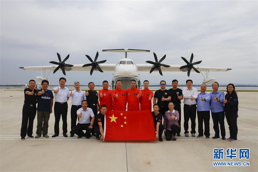 10月1日,AG600完成首次水上高速滑行試驗(yàn)后,機(jī)組成員及部分參研參試人員合影。 新華社發(fā)(中國(guó)航空工業(yè)集團(tuán)有限公司供圖)